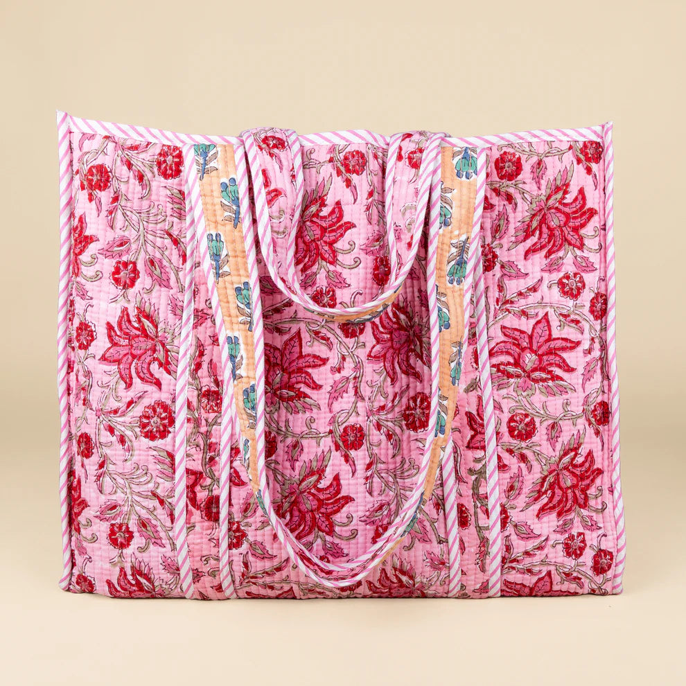 The cheerful prints on our bags and toiletry bags are hand-printed using a centuries-old technique called block printing. Wooden stamps are used to transfer the patterns one by one onto the fabric.