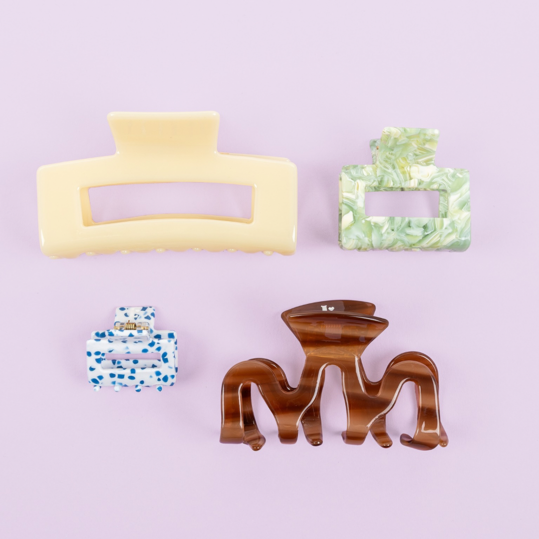 Unsere Haarspangen bestehen aus Celluloseacetat, einem pflanzlichen Biokunststoff mit ISCC PLUS-Zertifizierung. Im Vergleich zu erdölbasiertem Kunststoff ist Acetat nachhaltiger und biologisch abbaubar. Die Acetat- und Metallkomponenten wurden getestet und sind frei von Schadstoffen wie Blei, Cadmium und Phthalaten.