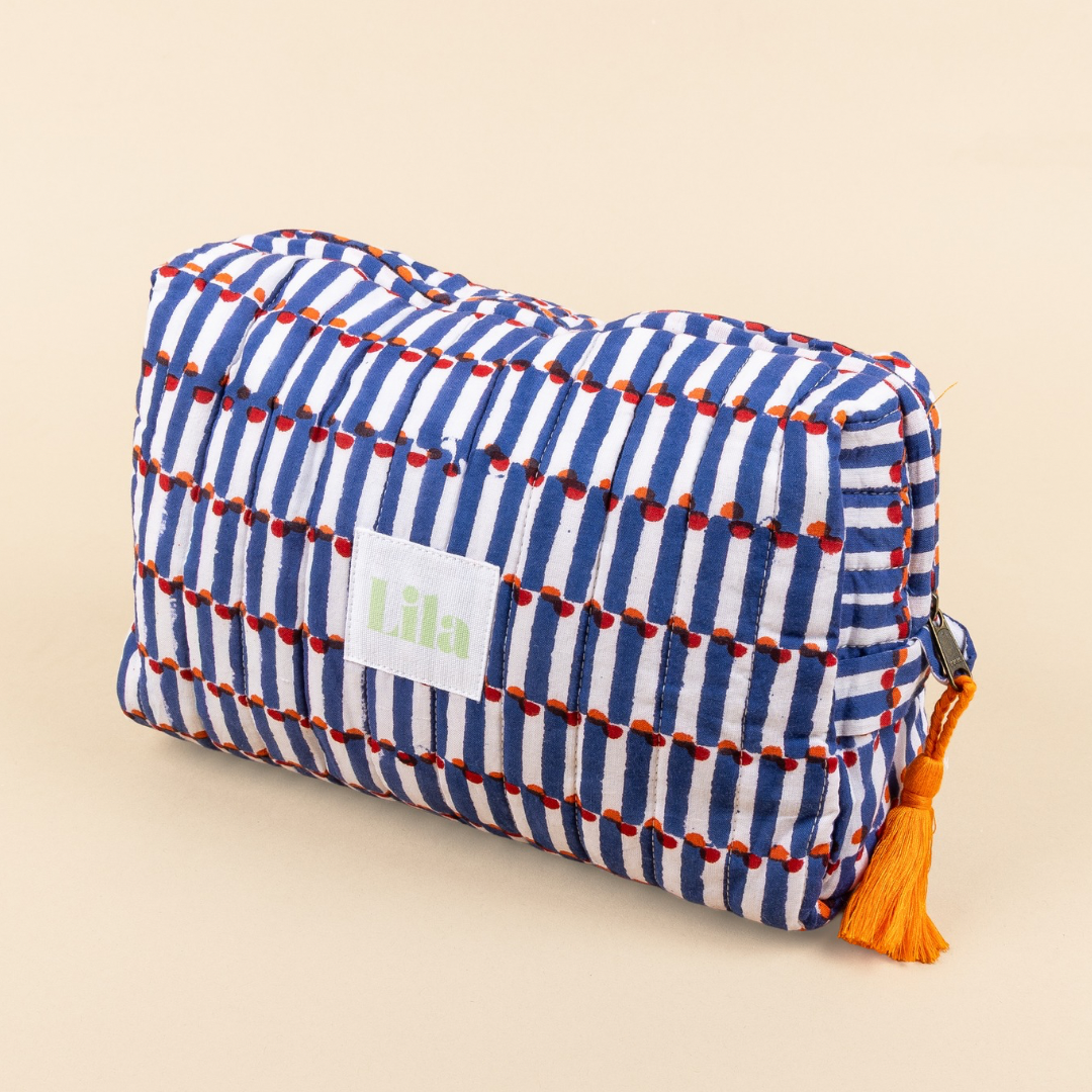 Deze prachtige toilettas is handgemaakt in India van 100% premium katoen en bedrukt met traditionele, met de hand gezette block prints. Elk ontwerp is door onszelf ontwikkeld en uniek dankzij het ambachtelijke drukproces.